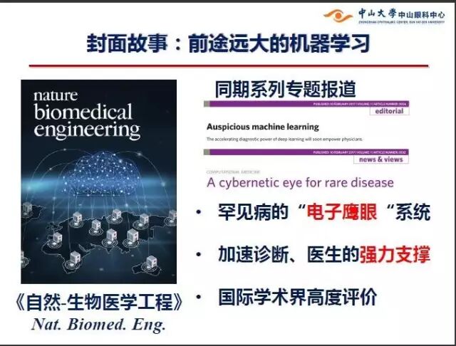 2017年2月,中山大学中山眼科中心刘奕志教授领衔中山大学联合西安电子科技大学的研究团队,利用深度学习算法,建立了“CC-Cruiser先天性白内障人工智能平台”。该人工智能程序,模拟人脑,对大量的先天性白内障图片进行分析和深度学习,不断反馈提高诊断的准确性。将该程序嵌入到云平台后,通过云平台上传图片,即可获得先天性白内障的诊断、风险评估和治疗方案。原创论文2017年2月份在《Nature Biomedical Engineering》杂志作为封面文章(封面故事:前途远大的机器学习)发表,并作为该期精选新闻。