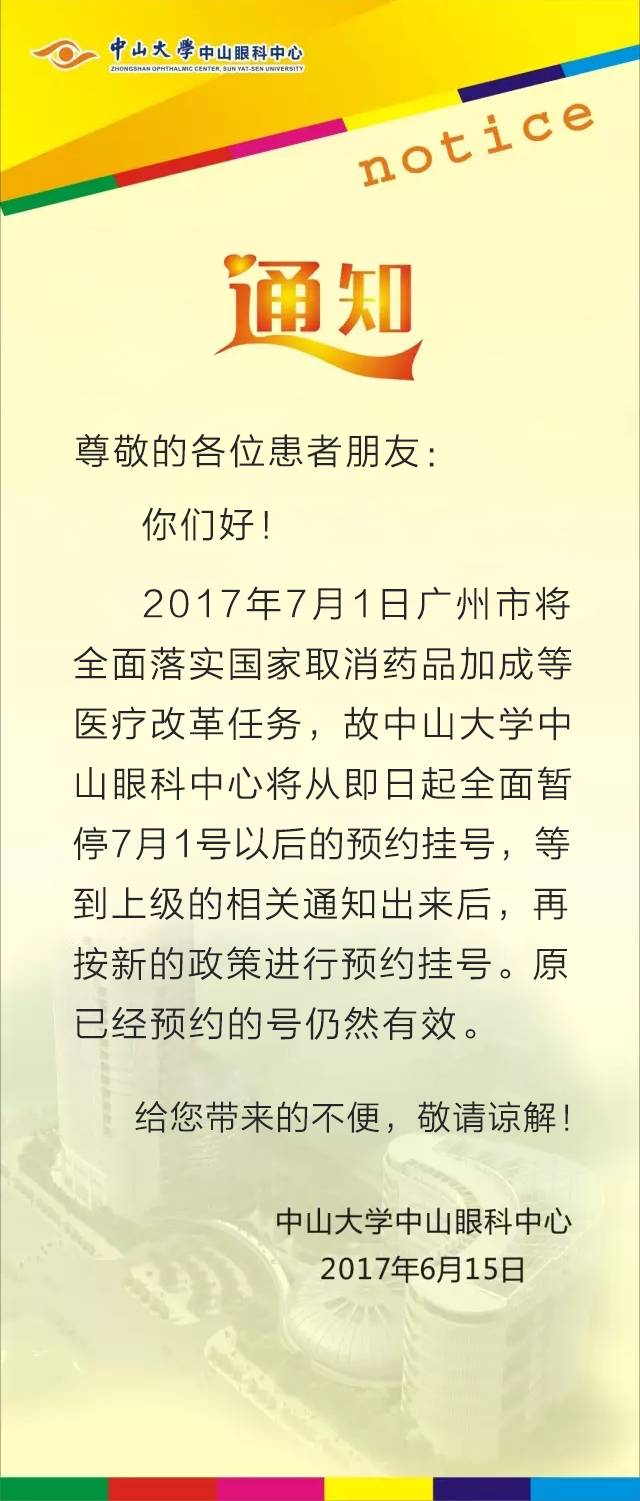 通知:中山大学中山眼科中心即日起全面暂停7月1日以后的预约挂号!