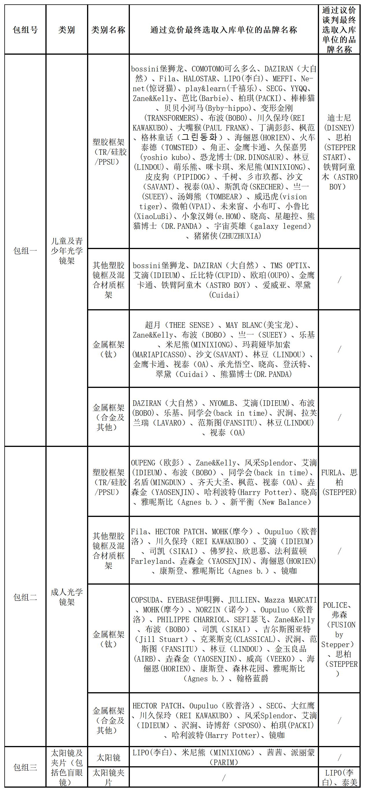 广东永连招标有限公司受广州中山眼科验光配镜有限责任公司及其关联公司的委托,对广州中山眼科验光配镜有限责任公司及其关联公司2026年度销售产品集中建库项目(眼镜架类)进行公开比选采购,以建库形式招标,现就最终入围结果公示如下: