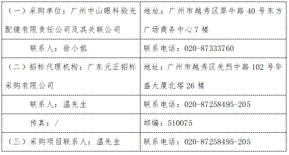 二、采购项目名称:广州中山眼科验光配镜有限责任公司及其关联公司2026年度销售产品集中建库项目(眼镜片类)